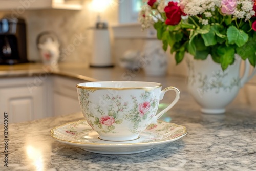 Cup and saucer on the counter, Generative AI