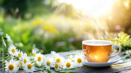 Cup of Coffee on a Wooden Table with Blooming Flowers in Soft Morning Light