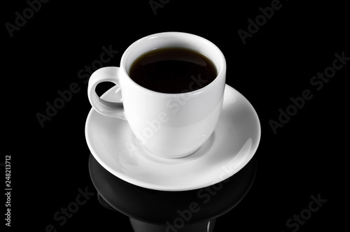 Cup of coffee on black reflective background.