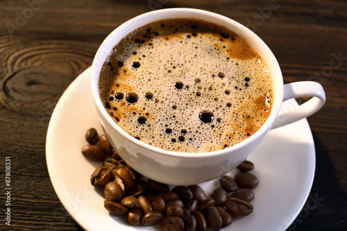 Cup of coffee on table close up