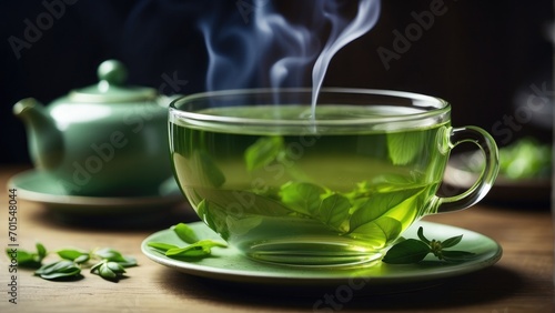 cup of green tea with mint and Spearmint leaf and smoky refresh background photo