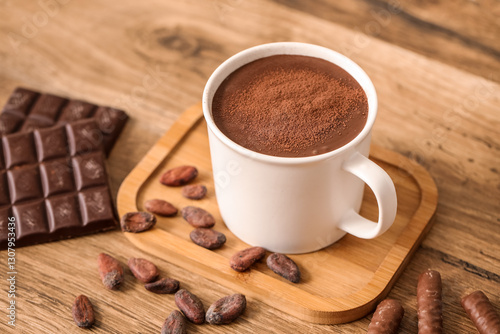 Cup of melted chocolate with chocolate beans on wooden table. Closeup