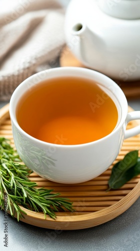 Cup of white tea on a bamboo tray with a teapot and fresh herbs beside it, highlighting the purity of white tea