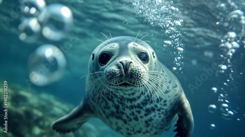 Curious seal pup underwater, ocean bubbles, marine life, wildlife documentary