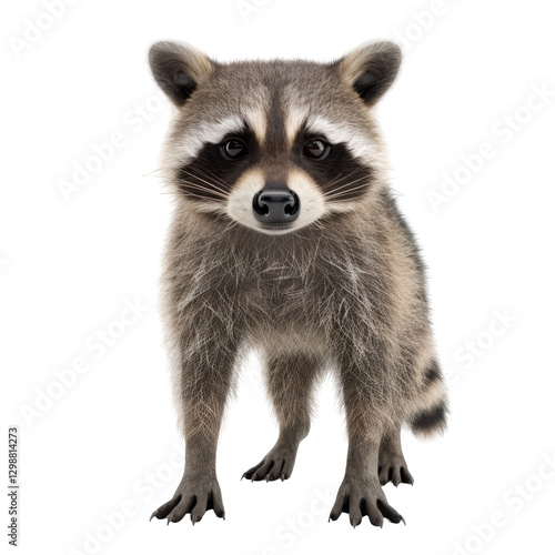 Curious young raccoon standing up with bushy tail and whiskers right in focus