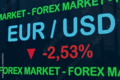 Currency EUR / USD - exchange rate. LED screen. Euro drops against USD. Infographic with percentage sign on the exchange screen. Currency trading, Forex and economy concept. 3D illustration