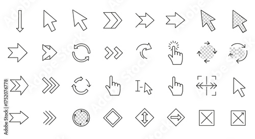Cursor and arrow line icon set. Collection of computer mouse pointers, hand click, and navigation symbols. Vector graphic elements for web design, user interface and GUI.