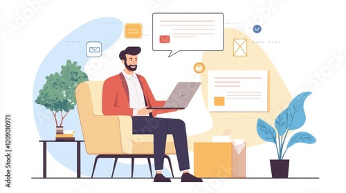Customer service engagement and resolution. A man working on a laptop in a modern, cozy office setting.