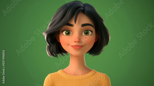 Customizable avatar of a unique personality virtual in a world. A cheerful young 3D cartoon woman with short dark hair and a yellow top, smiling warmly against a green background.