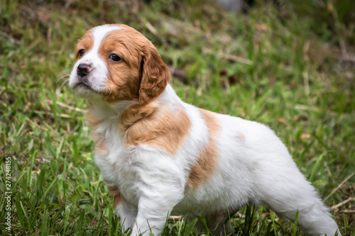 cute and curious brown and white brittany spaniel baby dog, puppy portrait isolated exploring