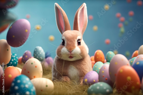 Cute and happy bunny with many easter eggs, Background with grass, festive background, Generative Ai