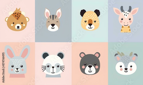 Cute animal faces in pastel colors on a squared background, vector illustration for baby room decor, wallpaper or poster design featuring different animals like rabbits and foxes, deer heads and panda