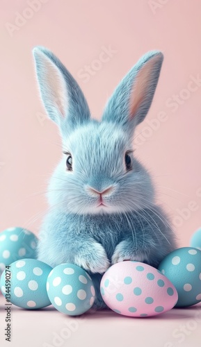 Cute Blue Easter Bunny with Polka Dot Eggs on Pastel Pink Background