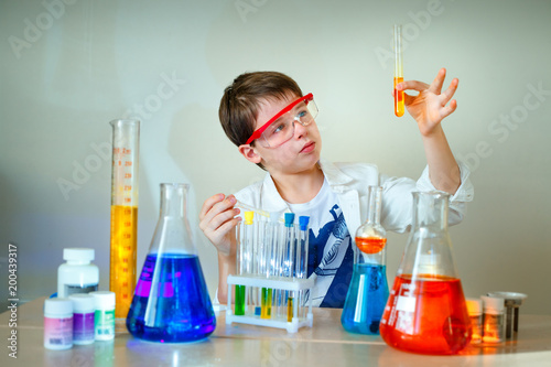 Cute boy is making science experiments in a laboratory