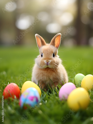 Cute brown bunny with colorful easter eggs on sitting in green grass, blurry outdoor background