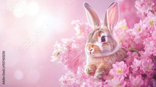 Cute bunny among pink blossoms for easter celebration and springtime joy