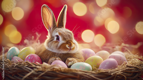 cute bunny sits in nest surrounded by colorful Easter eggs