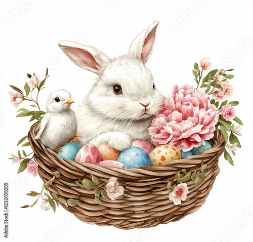 Cute bunny with colorful eggs and chick in a woven basket surrounded by flowers