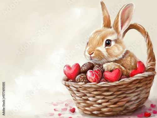 Cute Bunny with Heart Shaped Chocolates in Woven Basket