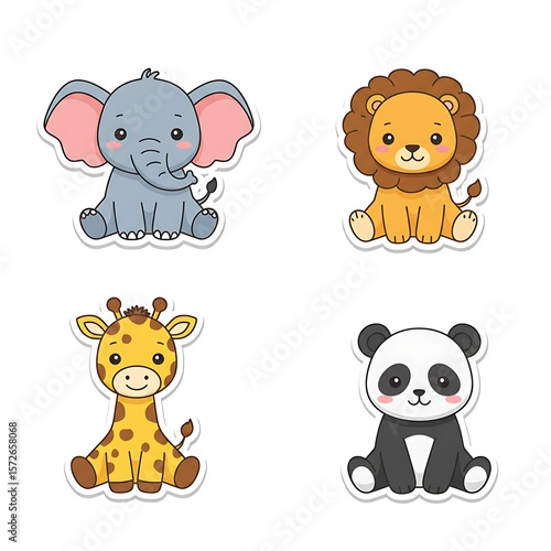 Cute Cartoon Animals: Elephant, Lion, Giraffe, and Panda Stickers on White Background