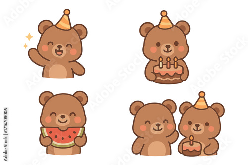 Cute cartoon bear character set celebrating a birthday party. Kawaii animal vector illustrations with cake, watermelon, and party hats. Adorable graphic element collection.