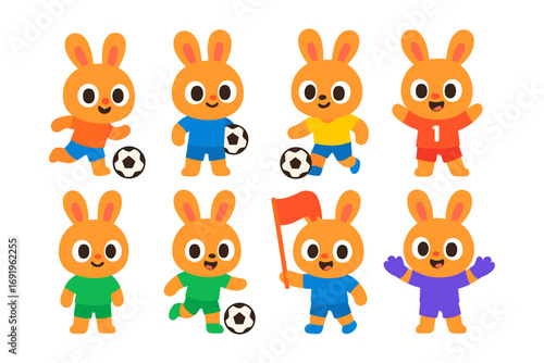 Cute cartoon bunny characters playing soccer in colorful outfits