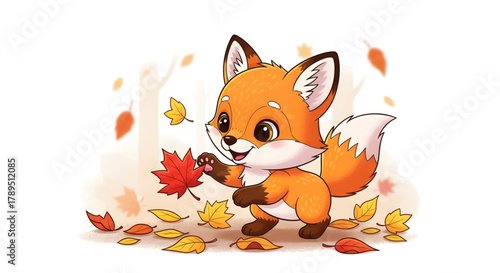 Cute cartoon fox playing with autumn leaves in a whimsical forest setting.