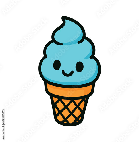Cute cartoon ice cream cone doodle with a happy face and blue ice cream scoop. Fun and colorful vector art perfect for summer designs, stickers, party invitations, or kids’ illustrations.