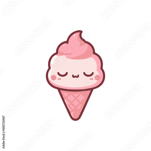 Cute cartoon ice cream cone with pink swirl and happy face on a white background