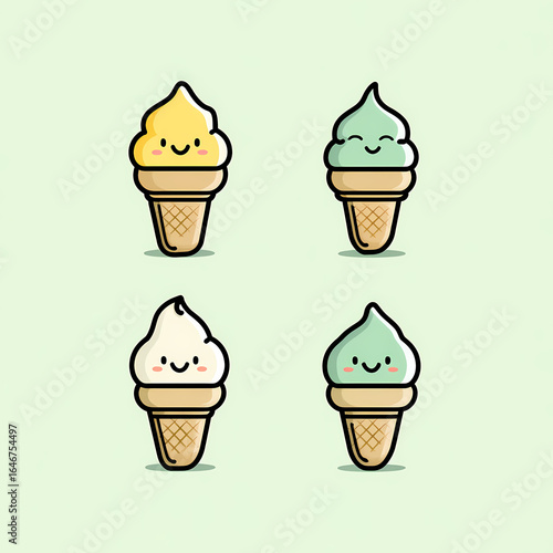 Cute cartoon ice cream cones with happy faces Yellow white and green dessert treats on a light background Yummy summer fun!