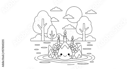 Cute cartoon krathong with flowers and candles floating on water isolated on transparent background