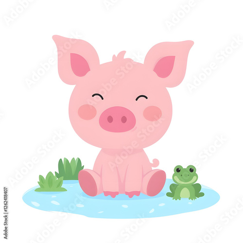 Cute Cartoon Piglet Sitting by Pond with Frog