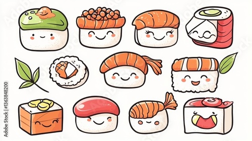 Cute cartoon sushi collection, various types, Japanese food, white background, illustration for menu or recipe