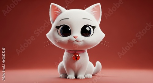 Cute cartoon white cat with big eyes sitting on red background