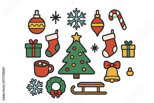 Cute Christmas and Winter Holiday Icons Set with Tree Ornaments Gifts and Snowflakes