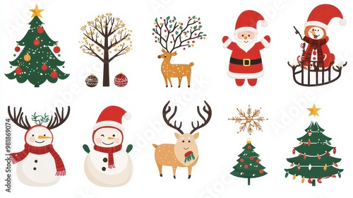 Cute Christmas Characters Santa Reindeer Snowman Christmas Tree Snowflake