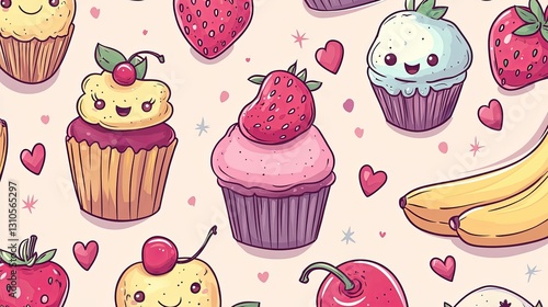 Cute Cupcakes Strawberries Cherries And Bananas Pattern