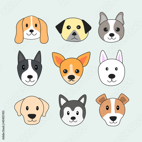 Cute Dog Faces Clipart design set. Different Dog breeds vector template.