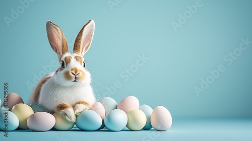 Cute Easter Bunny. Buny the Spring symbol. Easter holidays symbol. Easter Greeting card design, invitation template. Easter display with eggs and bunny