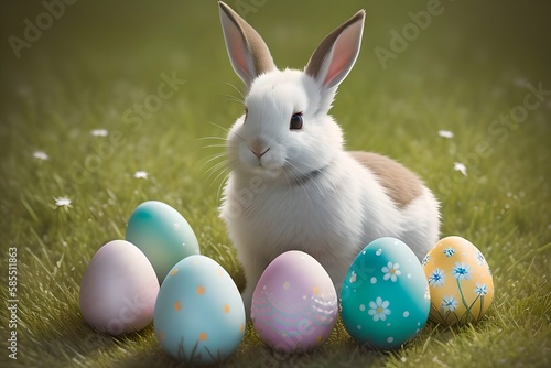 Cute Easter bunny sits next to each other in a wicker basket among painted eggs and colorful lights, golden rays of sunlight illuminate the green meadow.