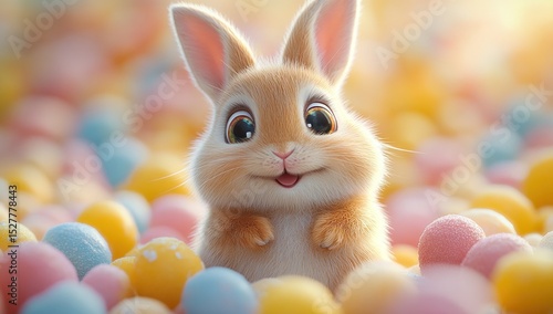 Cute Easter bunny surrounded by colorful eggs