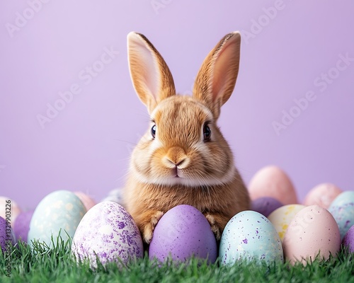 Cute Easter bunny with pastel eggs.