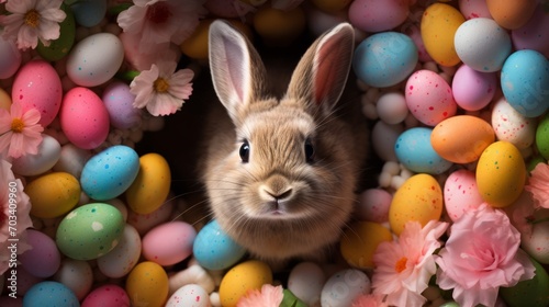 Cute Easter rabbit with decorated eggs and spring flowers. Easter background