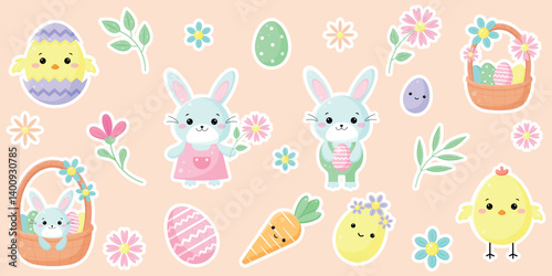 Cute Easter sticker pack isolated on beige background. Stikers with rabbits, chikens, Easter eggs, flowers, twigs, baskets, carrot. Spring collection. Vector illustration in flat cartoon style.