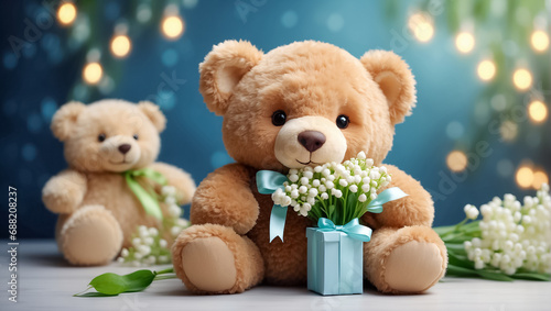 Cute funny teddy bear toy, with a gift box with a bow, with bouquets of lily of the valley flowers romantic