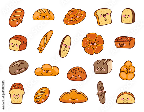 Cute kawaii bread with smiley face. Bakery food cartoon characters. Hand drawn style. Vector drawing. Collection of design elements.