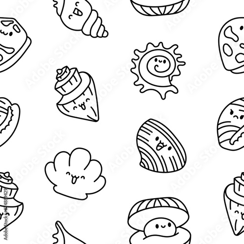 Cute kawaii sea shell. Seamless pattern. Coloring Page. Cartoon aquatic life. Marine seashell characters, summer vacation. Hand drawn style. Vector drawing. Design ornaments.