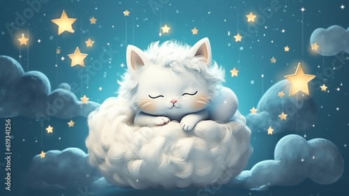 cute kitten sleeping on a cloud watercolor drawing. Generative AI