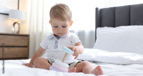 Cute little baby playing with toy pyramid on bed at home