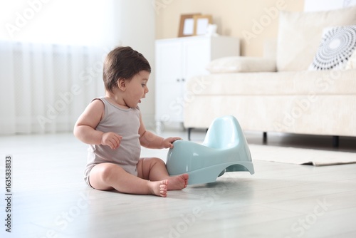 Cute little baby with potty on floor at home